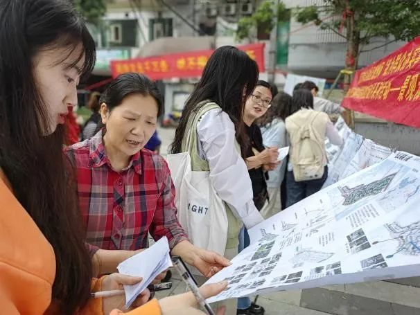 5月17日,社区规划师团队李圆圆、王波、蒋勇在北碚区奔月路开展“我为群众办实事”暨edddh