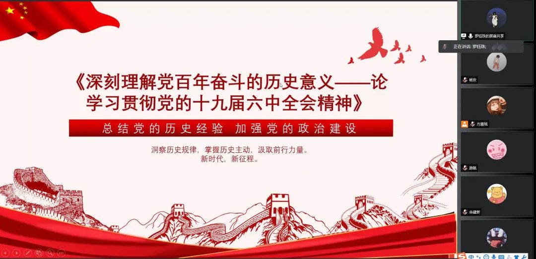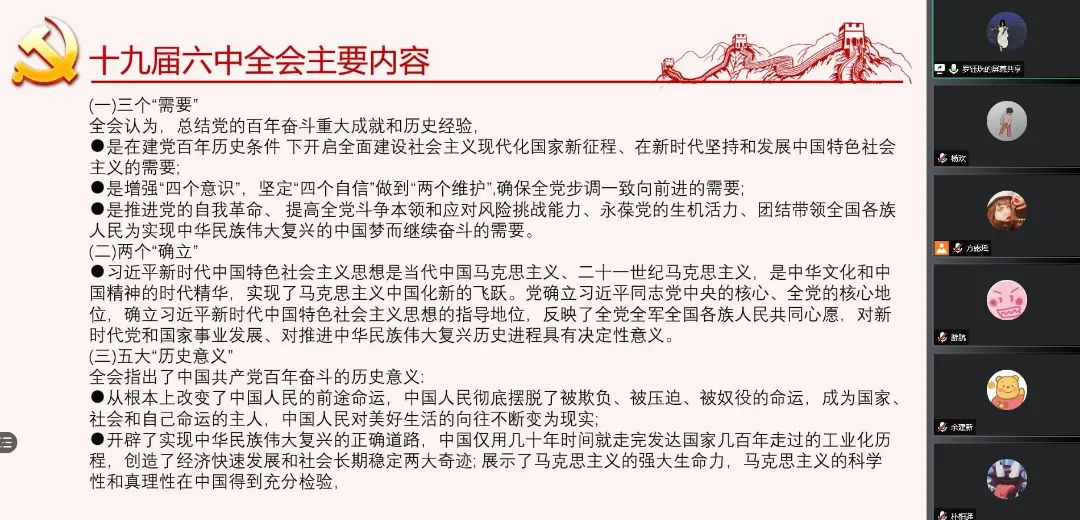 此次会议分三个议程进行,分别为学习十九届六中全会主要精神、回首历届六中全会、观看十九届六中全会相关视频并邀请学生代表发言。会议由学术科技部方露瑶同学主持,刘溢、罗钰珠两位同学讲解会议其核心内容,edddh