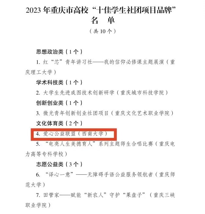 爱心公益联盟脱颖而出,荣获重庆市高校“十佳学生社团项目品牌”称号。