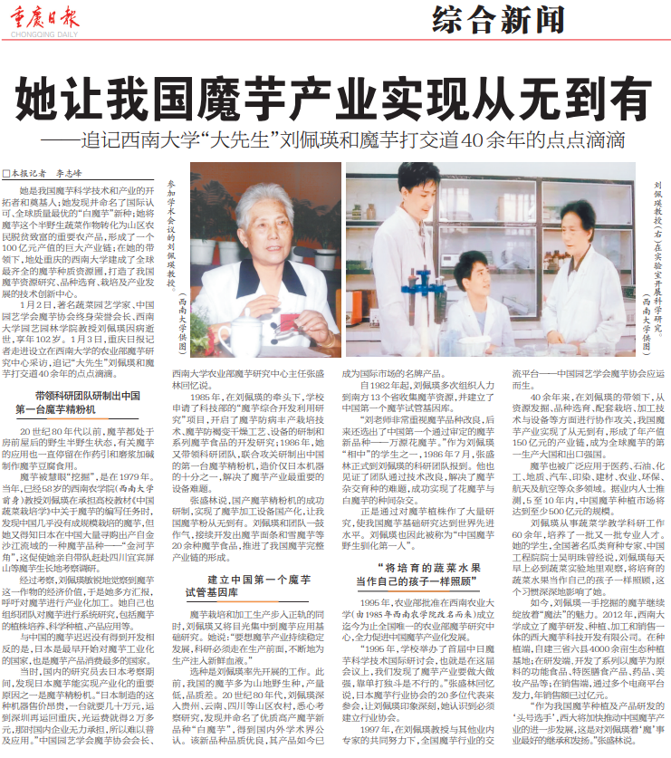 的建设和发展做出了极其重大的贡献。刘佩瑛教授逝世是园艺领域的重大损失,但她在魔芋行业中的突出贡献依然被社会铭记。1月5日,重庆日报记者走进edddh