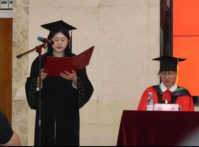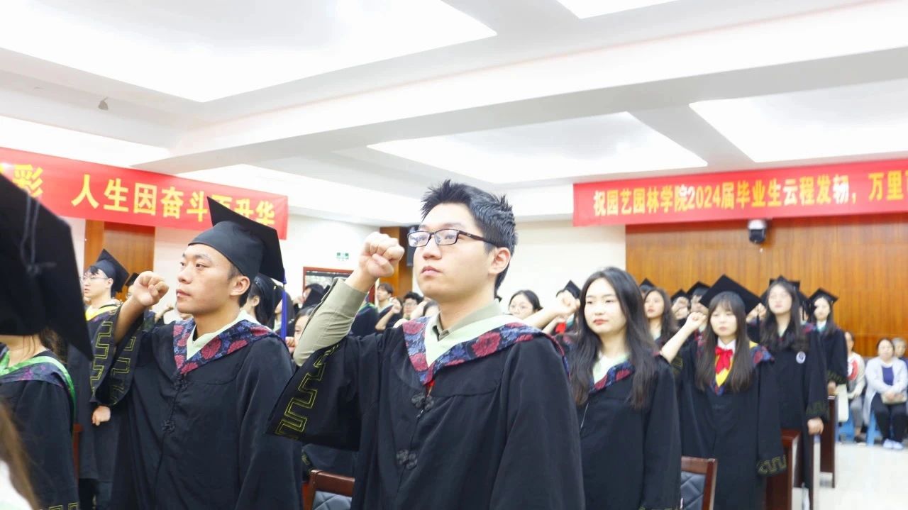 在毕业生宣誓环节,2024届毕业生代表张程凯领誓,全体毕业生庄严起誓。誓言嘹亮,掷地有声,代表着艺林学子对未来的凌云豪情,不负学校的期望和老师们的谆谆教诲。