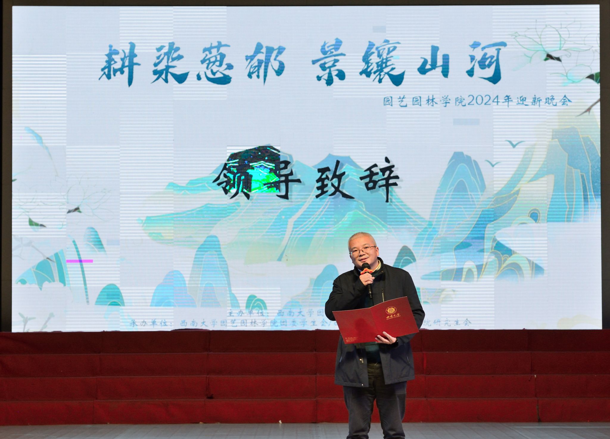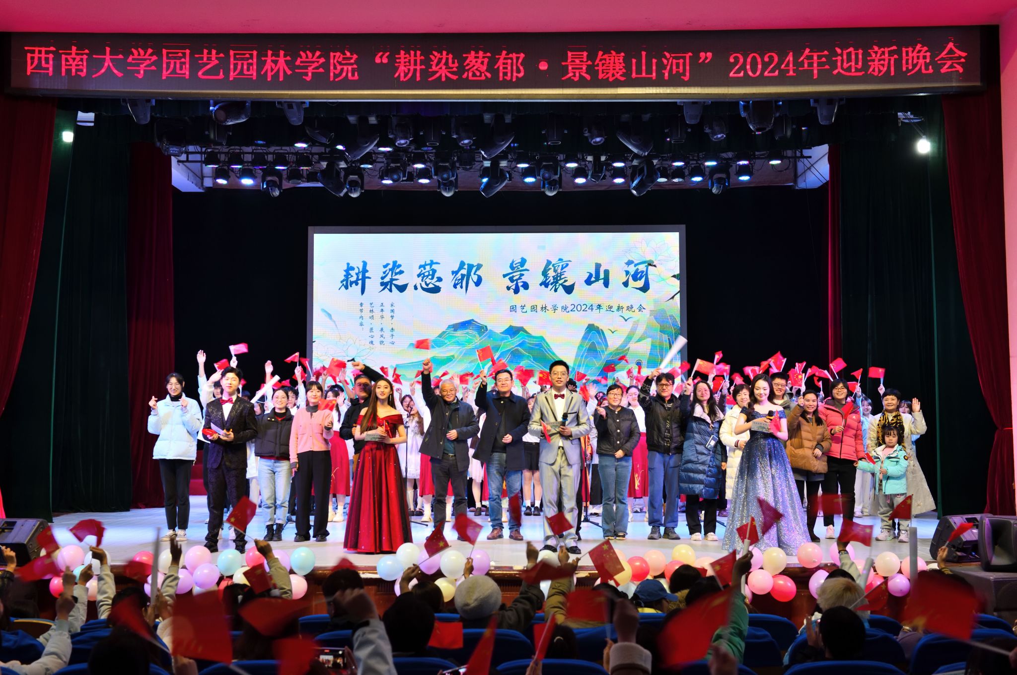 12月5日,“耕染葱郁,景镶山河”——学院2024年迎新晚会在光大礼堂圆满举行。学院党委书记潘玉锋,院长宋洪元,学院党委副书记、纪委书记王强,副院长周建华,以及学院教师和学生共800余人齐聚一堂,共享欢乐时刻。