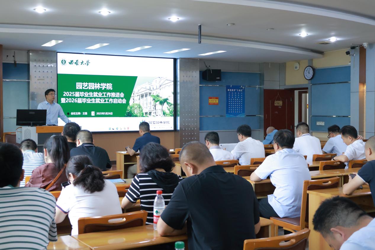 会上,四位老师分别代表导师、班主任、辅导员进行交流发言。园艺系主任、研究生导师代表潘宇分享了园艺系在升学中的一些成功经验,分析学生在求职时的一些共性问题,提出要进一步引导学生转变就业观念。风景园林系主任、2024届本科生班主任代表杜文武提出要根据当前行业现状优化人才培养,使学生的知识技能更加符合当前社会需求,同时要与用人单位加强联系,为学生拓宽求职渠道。2026届本科生班主任代表刘海利提出要关心关爱学生,提升集体凝聚力,提前进行就业谋划,并进行分类指导。团委书记、学生工作办公室主任谭泽轩分享了辅导员队伍在毕业生情况摸排、就业信息推送、访企拓岗、分类指导等方面的工作,以及应届生认定的相关政策规定。