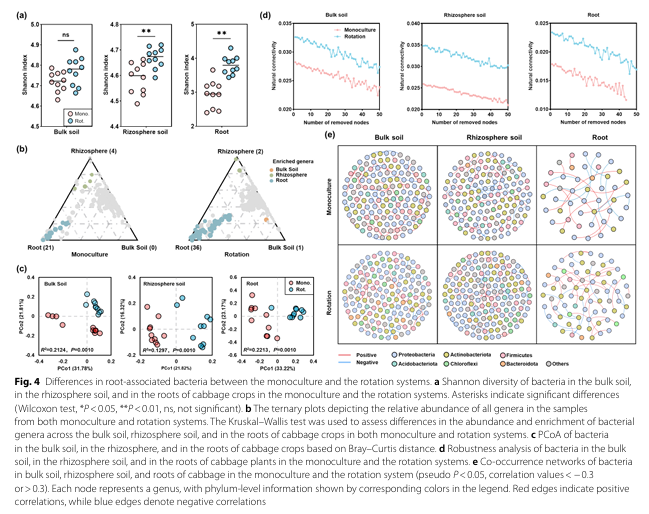 该研究系统揭示了“植物代谢物—微生物—轮作作物”之间的三者互作机制,表明荞麦轮作通过根部分泌黄酮类物质重塑土壤微生物群落,并建立跨作物的“微生物遗产效应”,显著提升后茬甘蓝对根肿病的抵抗力。这一机制打破了传统“病害压力决定病害程度”的认知,表明通过调控微生物组而非直接作用于病原本身,也可实现有效的病害管理。