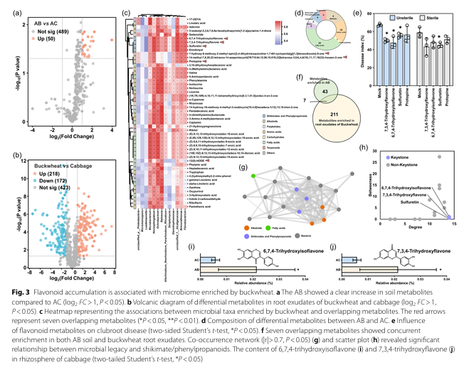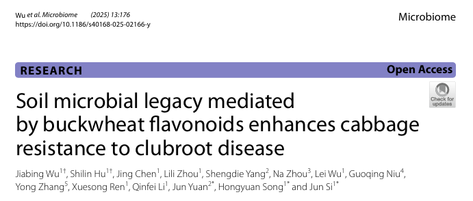近日,学院司军教授、宋洪元研究员联合南京农业大学袁军教授团队在国际微生物组权威期刊Microbiome发表了题为Soil microbial legacy mediated by buckwheat flavonoids enhances cabbage resistance to clubroot disease的研究论文。该研究系统阐明了荞麦通过分泌特定黄酮类物质,重塑土壤微生物群落,并增强后茬甘蓝对根肿病抗性的机制,为构建精准化的绿色轮作模式提供了理论依据和实践路径。