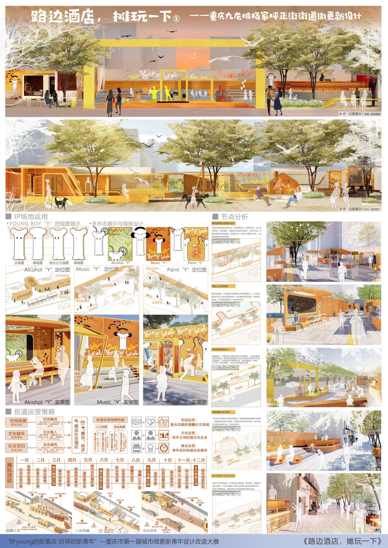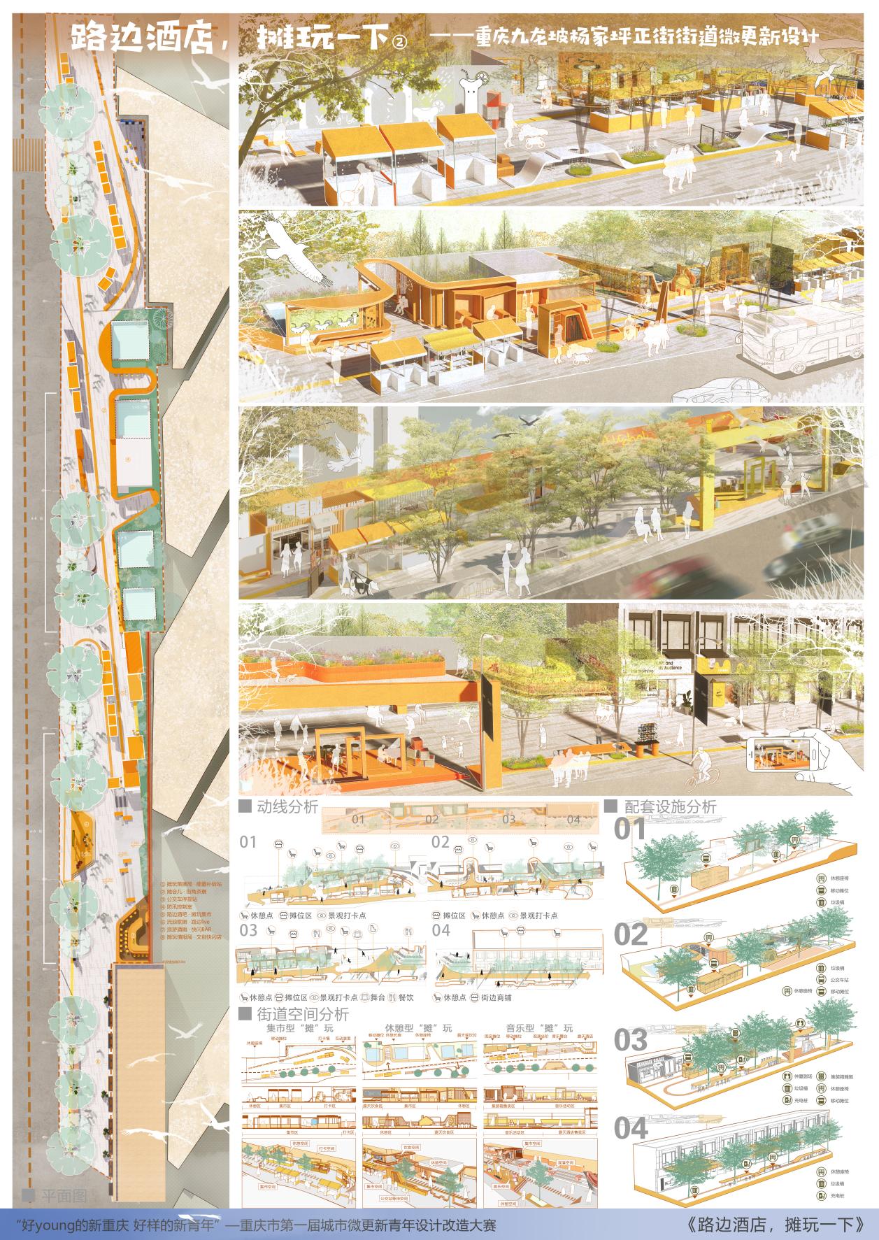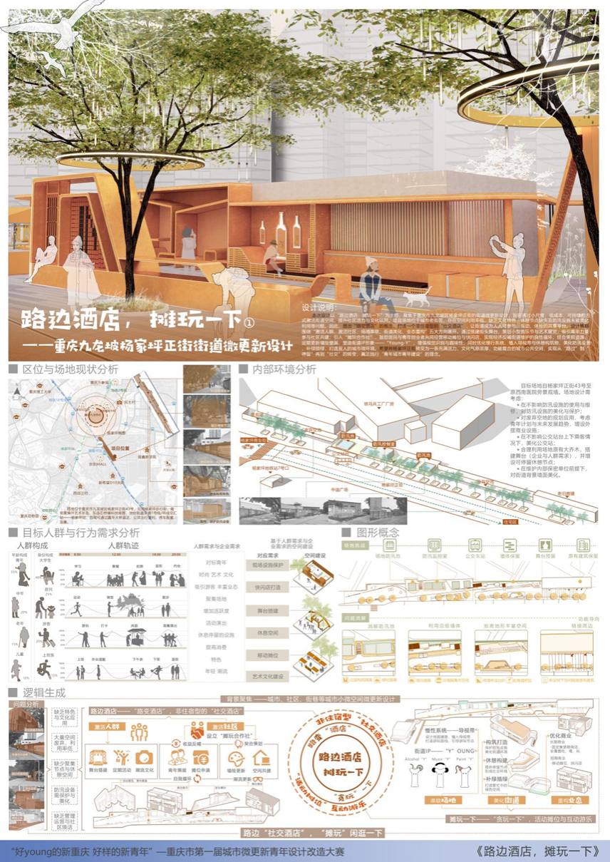 ·设计理念:作品选取九龙坡区杨家坪正街一段老旧街道为改造对象,提出“路边酒店”新概念——它不是提供住宿的传统酒店,而是一个开放、共享的“社交酒店”,旨在通过微更新激活街道,让每个人都能在这里相遇、互动和体验。设计以人群激活、社区协同、空间串联、视觉焕新、功能复合五个策略为切口,除关注空间改造外,更强调社区共建、青年参与和文化传承,真正让老街从“路过”变为“停留”,从“闲置”变为“活力”,探索出城市微更新中“青年创造青年城”的重庆路径。