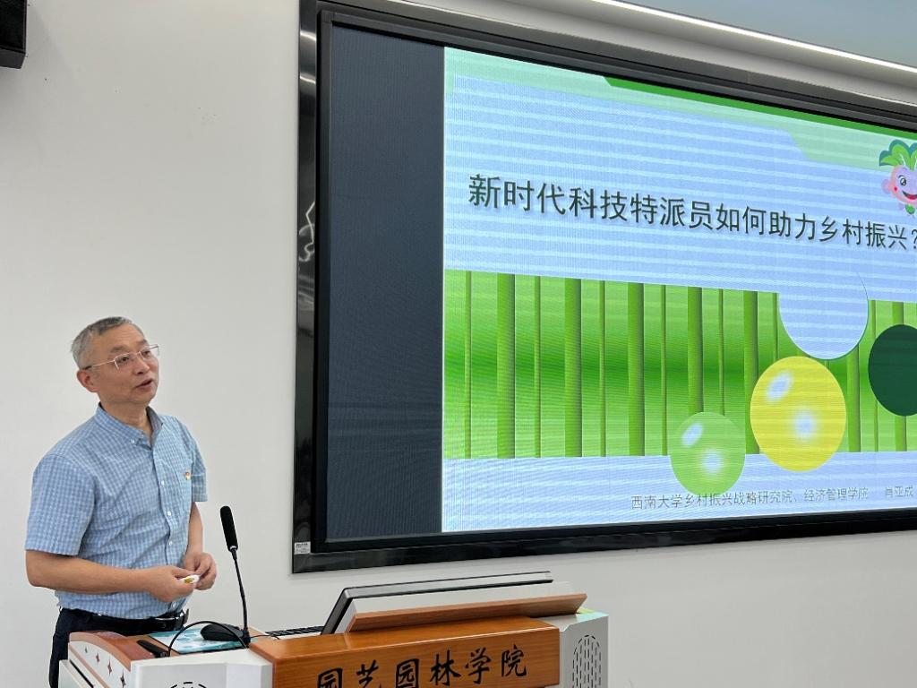 乡村振兴战略研究院、经济管理学院肖亚成教授做题为“新时代科技特派员如何助力乡村振兴”的报告,结合国内外形势、粮食安全、农村发展,多方探索科技特派员的使命和工作模式。