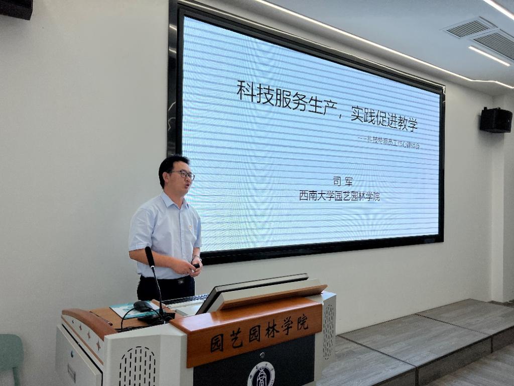 司军副教授结合教研室教学工作,通过秀山县、酉阳县、璧山区的科技服务经历,提出实践促进教学的理念。具体体现在实践课程、本科毕业论文、专业实习和科技特派员工作相结合。汪卫星副教授做了“立足本职、服务乡村、时代使命、砥砺前行”的报告。结合农民、政府、社会、高校面临的问题和需求,提出科技特派员应该从智力、技术、责任、资源、情怀方面发力,有效助力乡村振兴战略。