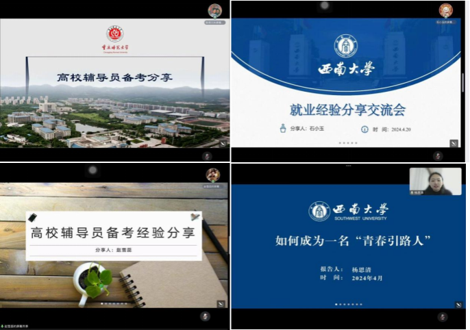 本期活动邀请到四位优秀毕业生榜样为在校生进行经验分享,分别是陈得文,2016级果树学专业研究生、现为重庆师范大学辅导员;石小玉,2020级化学专业研究生、现为edddh