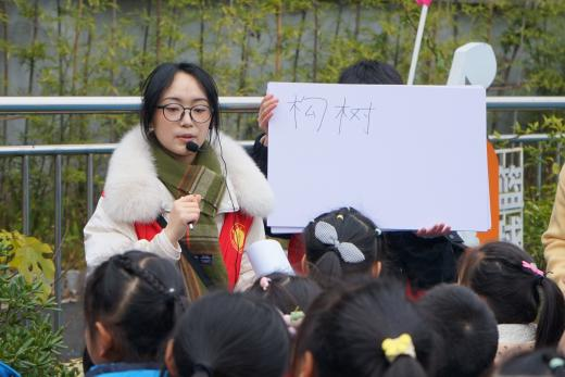 最后,实践队成员李琳带领学生们来到户外,开展户外植物认知与挂牌活动。李琳引导学生通过视觉观察、触觉感受、嗅觉感知等方法去认识植物,激发学生认知植物、探索自然的兴趣。随后,学生们自由观察校内植物,充分发挥想象力制作创意植物名牌,将植物名牌挂在树枝上并合影留念。户外植物认知挂牌活动帮助学生巩固课堂所学,进一步加深学生们对植物特征的理解,增强他们尊重自然、保护环境的意识。