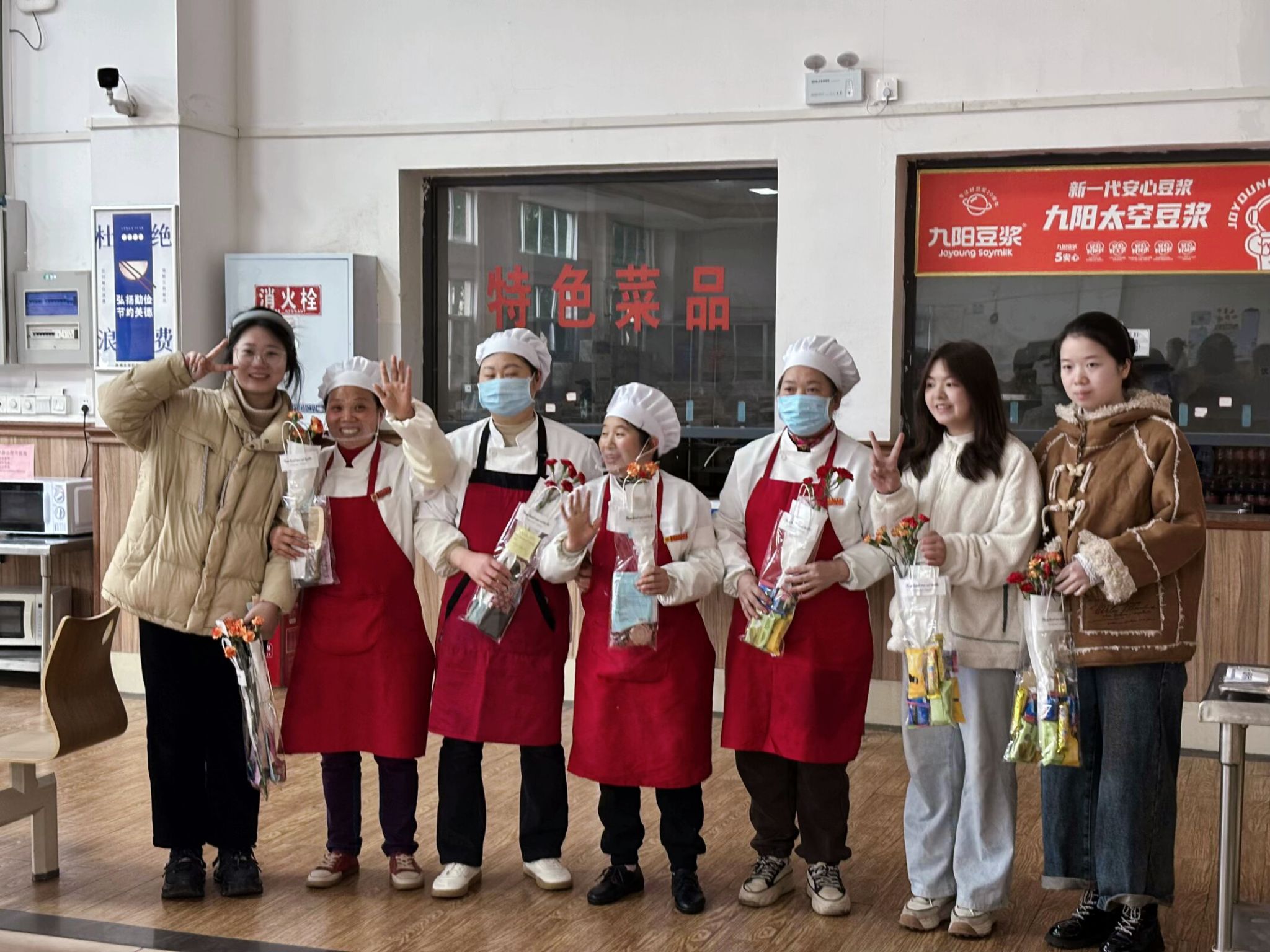 随后,同学们分组前往食堂、宿舍楼、教学办公楼和共青团花园,开启了一场温馨的“献花之旅”。在食堂后厨,同学们将精心准备的鲜花和小礼物递到正在忙碌的阿姨们手中。一位阿姨停下手中的工作,轻轻擦拭着双手,小心翼翼地接过鲜花和礼物。她的眼眶微微泛红,声音中带着感动,“没想到孩子们这么用心,这份礼物让我觉得所有的辛苦都值得了!”