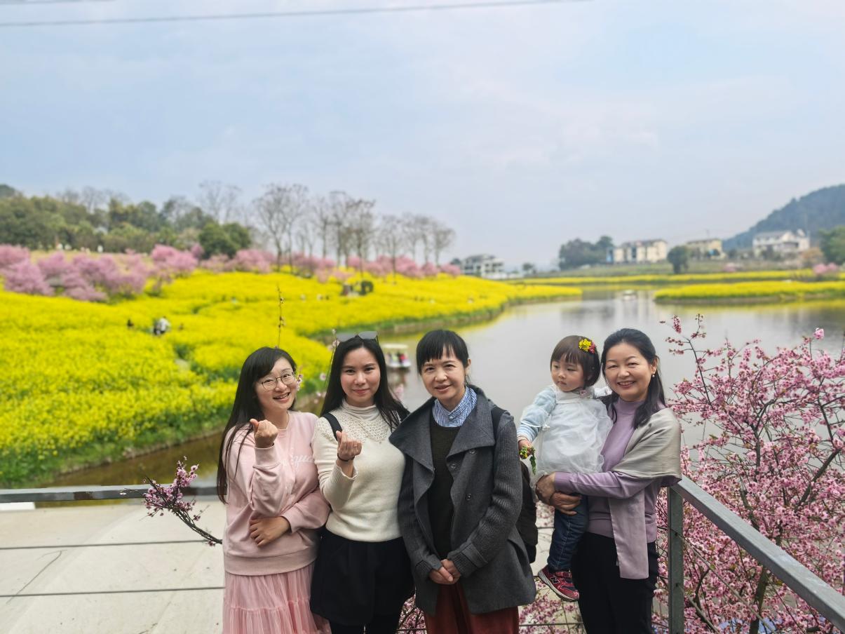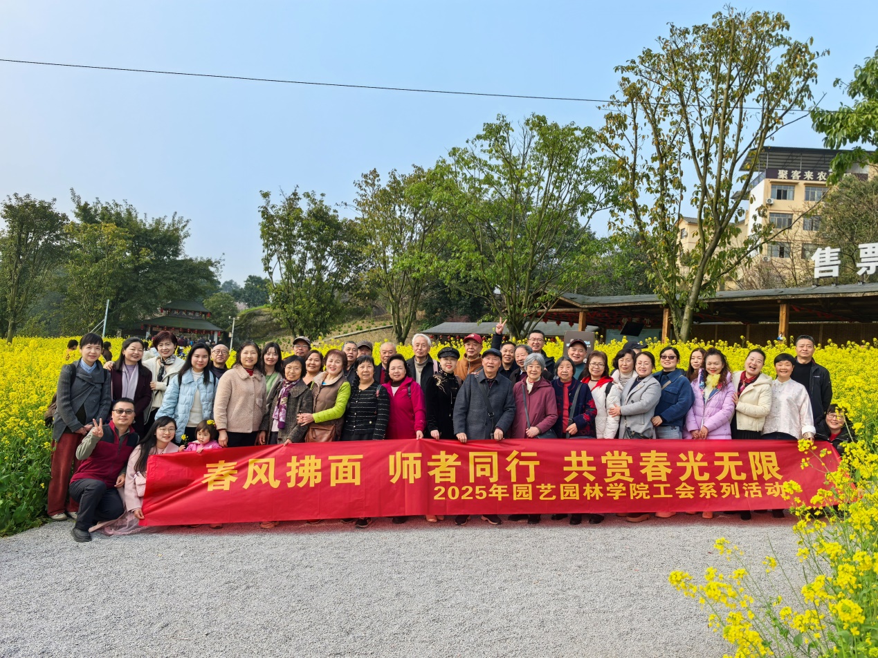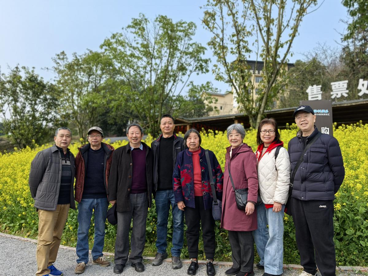 上午10时,学院教职工抵达重庆市巴南区二圣镇,天坪山的海拔高度约600 米,山顶平坦开阔,四周群山环绕,自然植被丰富,现已建成的核心景区约1100亩,包括十里花果休闲长廊、清华白鹭潭湿地公园、滨湖花海、星空露营、水上运动、格桑花海、紫薇园、海棠园、杜鹃园、杨梅园等景点,孕育出了花海、湖景、民宿、露营、亲子、采摘、研学、团建、赛事等特色农文旅体验项目,是重庆主城近郊的高山花海农文旅主题景区。层叠错落的油菜花海间嵌着青石板铺就的观景步道,学院教职工们穿过生态廊桥步入梯田景观带,层次分明的梯田花海与白墙黛瓦的川东民居相映成趣。作为国家级现代生态农业创新示范基地,该地以“科技赋能农业、美学重塑乡村”的实践成果,生动呈现了一幅乡村振兴的鲜活画卷。