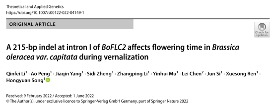 宋洪元团队在植物遗传育种领域国际知名杂志《Theoretical and Applied Genetics》在线发表了题为《A 215-bp indel at intron I of BoFLC2 affects flowering time in Brassica oleracea var. capitata during vernalization》研究文章,该项研究不仅提供了一种有效的耐抽薹分子标记辅助选择策略来鉴定结球甘蓝资源和促进新品种选育,也为探索绿体春化植物开花机制提供了切入点。